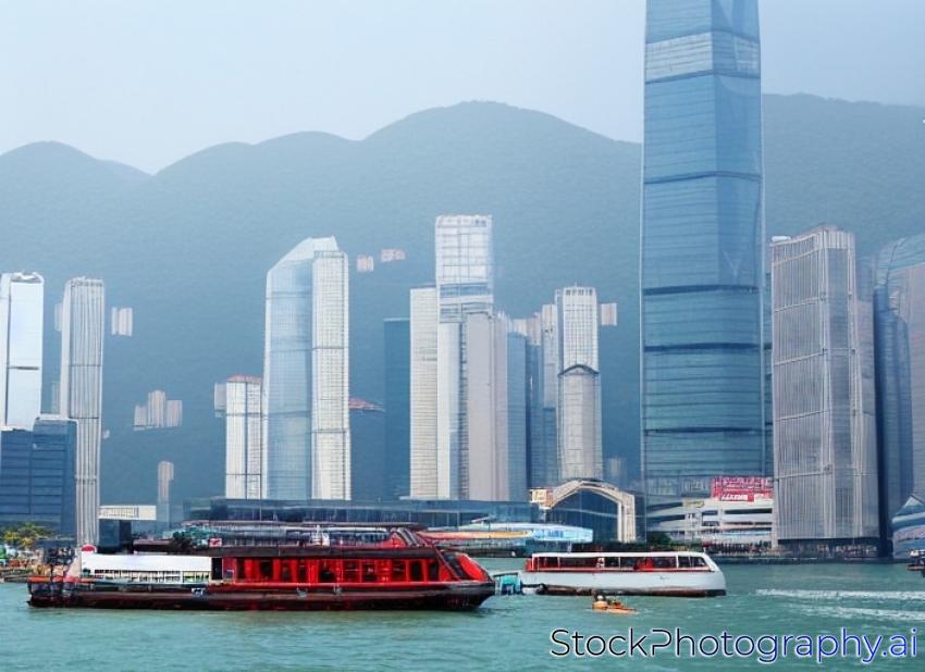A ferry on the Hong Kong Victoria Harbour. Modern buildings at the background.