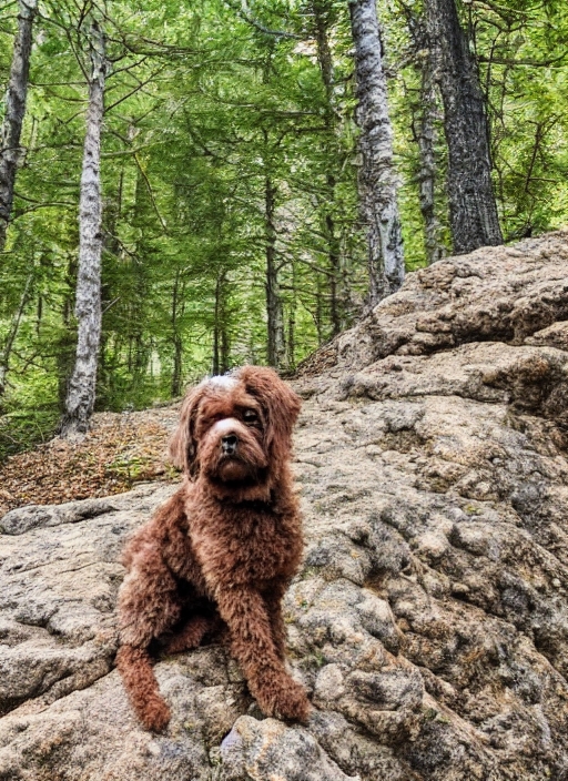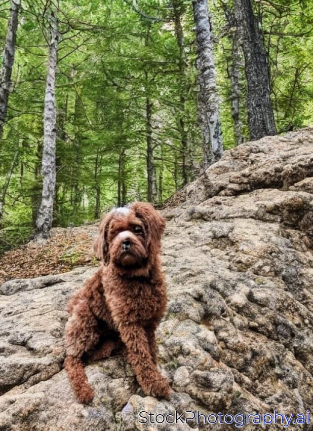 A brown dog in the woods standing between big rocks on a partly cloudy day. The dog breed is lagotto romagnolo also known as the truffle dog.