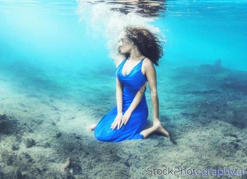 A woman in a long blue dress posing underwater