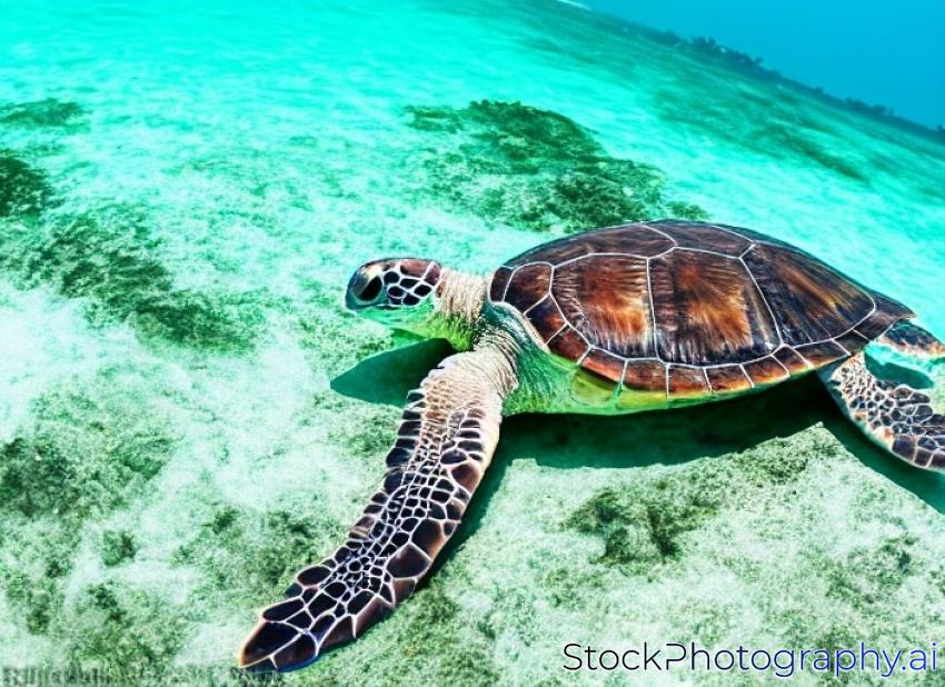 A green sea turtle, with its lovely brown shell, leisurely swims in the clear waters of a Bora Bora lagoon.