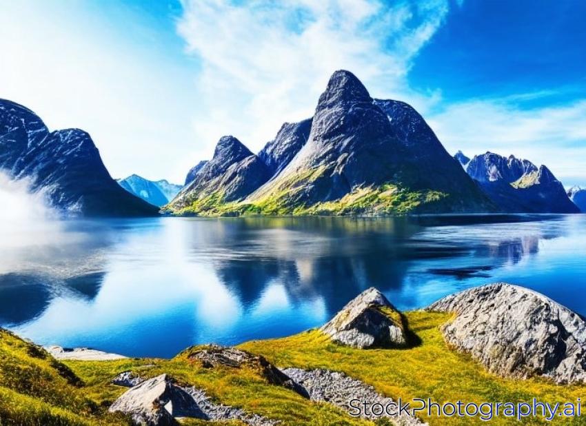 Classic norwegian scandinavian summer mountain landscape view with mountains, fjord, lake with a blue sky, Norway, Lofoten Islands