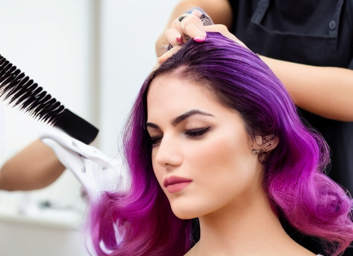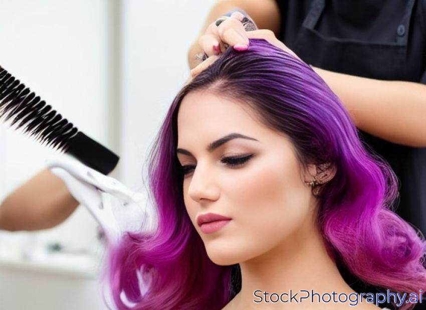 Closeup of hair dresser applying chemical color dye onto hair of customer in salon