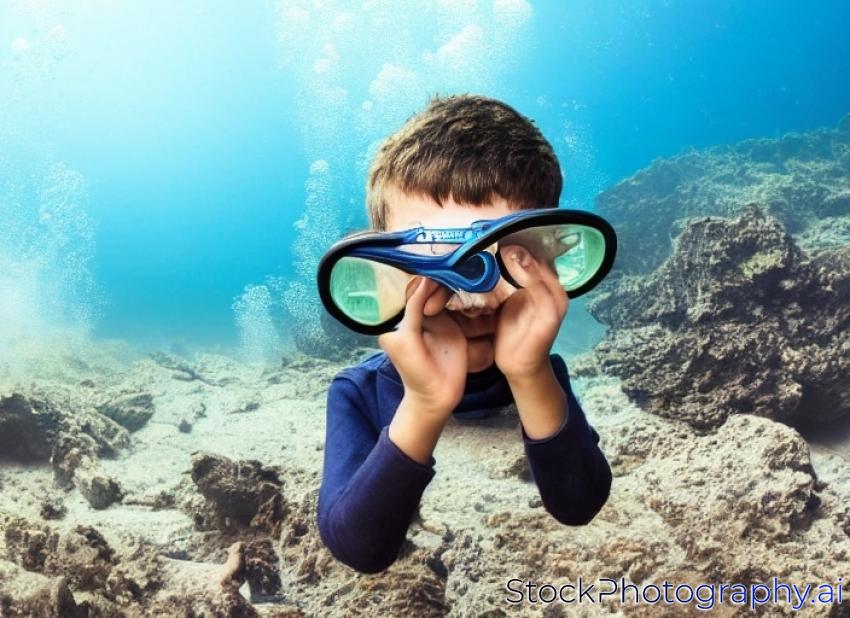 A boy with a goggles for diving, poses a photographer