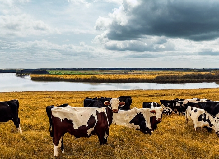 A herd of cattle, mainly cows and bulls, grazing on a large field located next to a muddy lake covered with reeds and a vast forest or moor with a cloudy autumn sky being above the animals in Poland