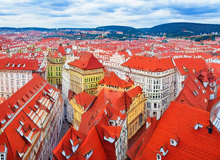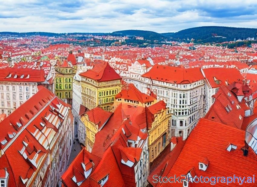 Aerial view of Red Tiles roofs in the city Prague, Czech Republic, European travel. Beautiful Autumn day with blue sky with clouds in the town.