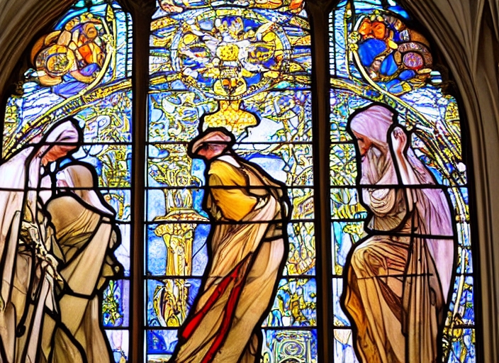 Art Nouveau painter Alfons Mucha Stained Glass window in St. Vitus Cathedral, Prague, Czech Republic