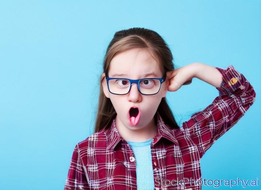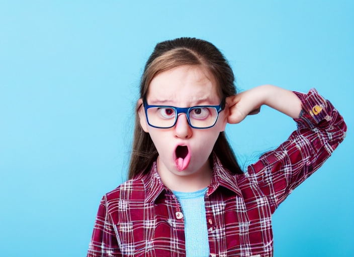 Dissatisfied little kid girl with glasses wearing plaid shirt over blue background frowns face, has disgusting expression, shows tongue, expresses non compliance, irritated with somebody.