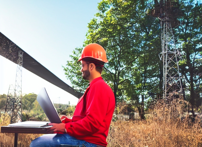 Electrical engineer with red hard hat using laptop outdoors in front of a high voltage power lines
